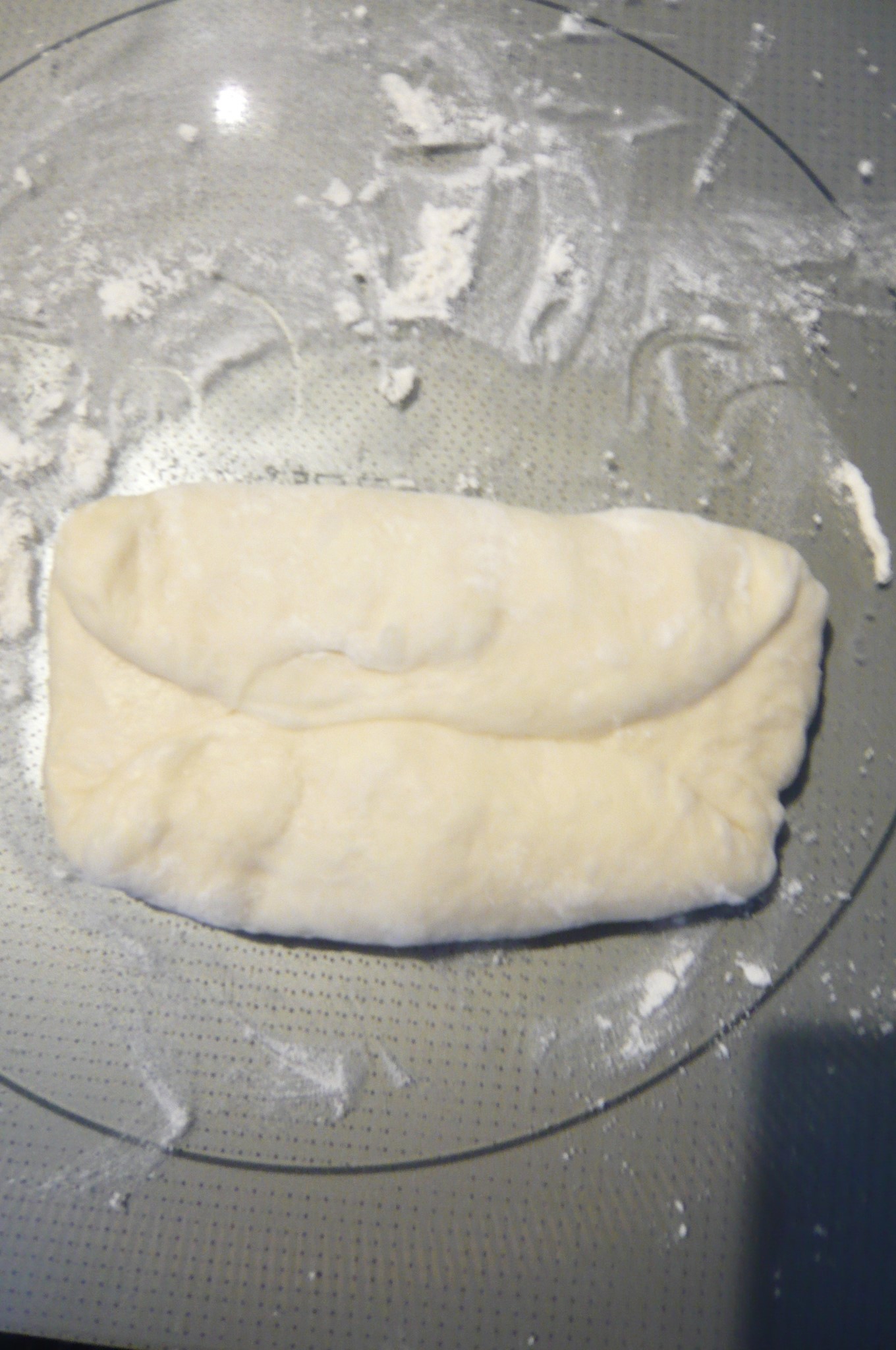 麺棒で、15cmほどの円に伸ばし、両端を折りたたみ、更に真ん中で折る。しっかりととじ目をとじる。