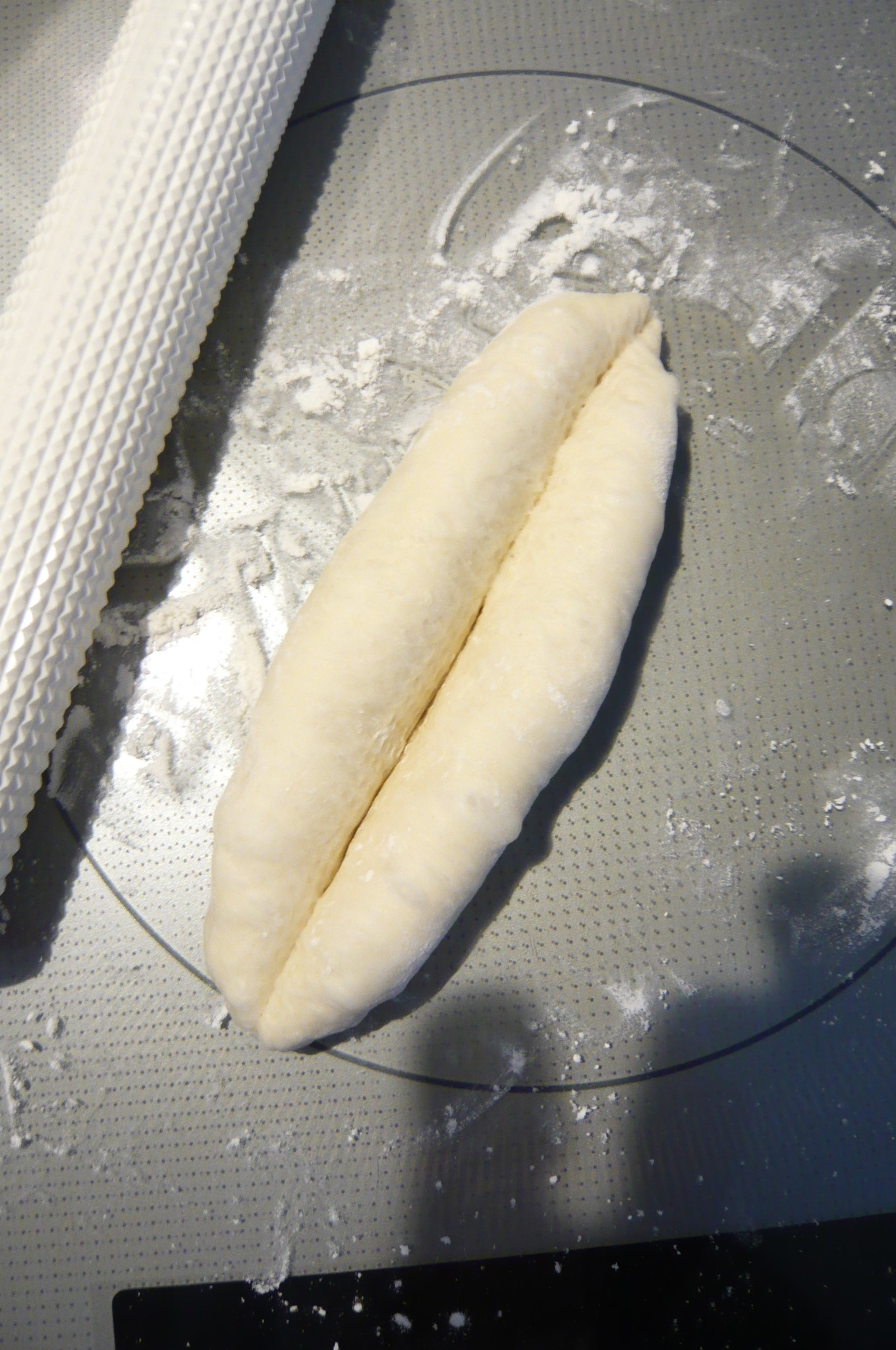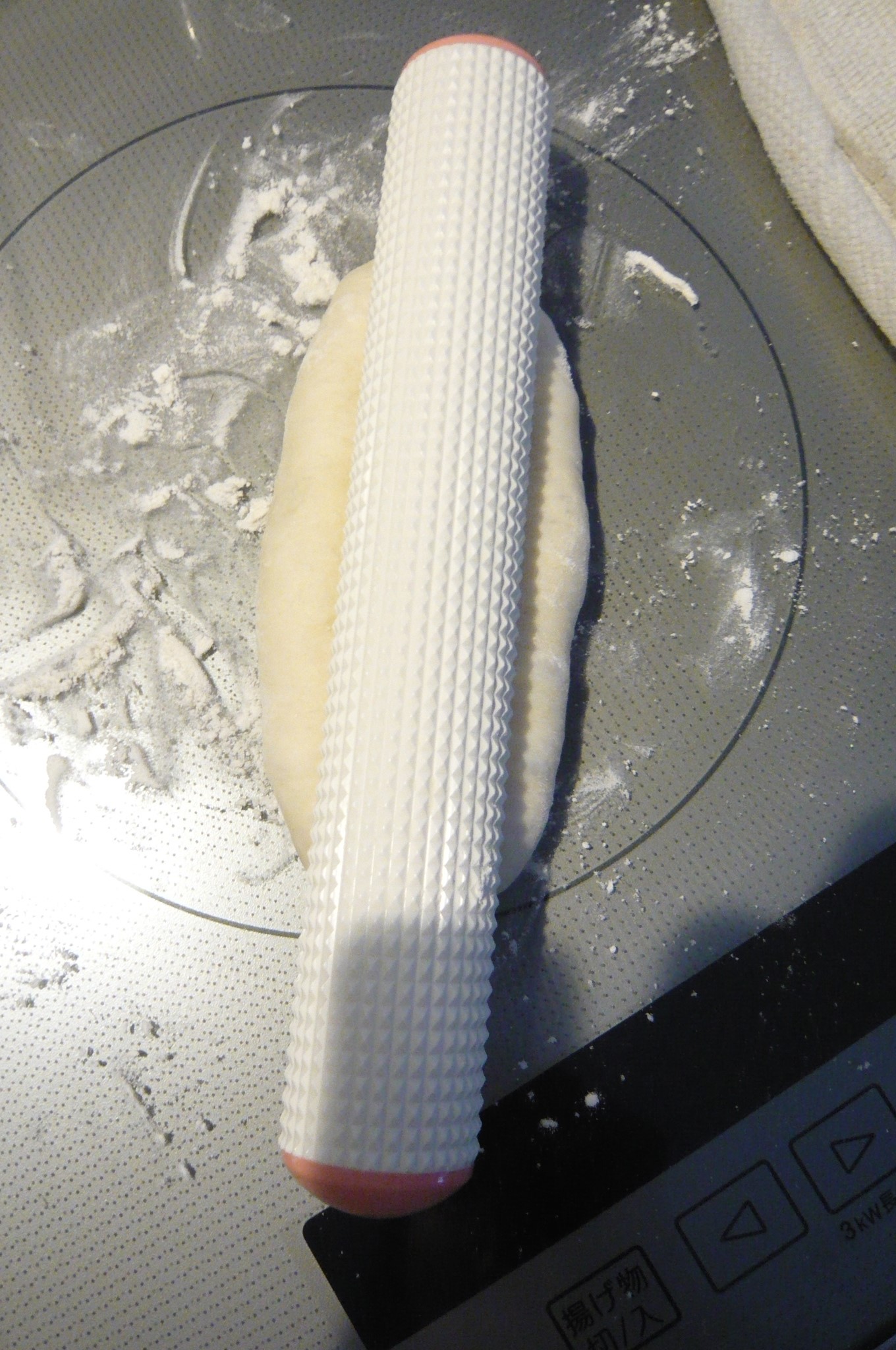 ひっくり返してとじ目を下にして、中央を麺棒でおさえる。オーブンペーパーを敷いた天板に並べ全体をビニール袋で覆い2次発酵40分。