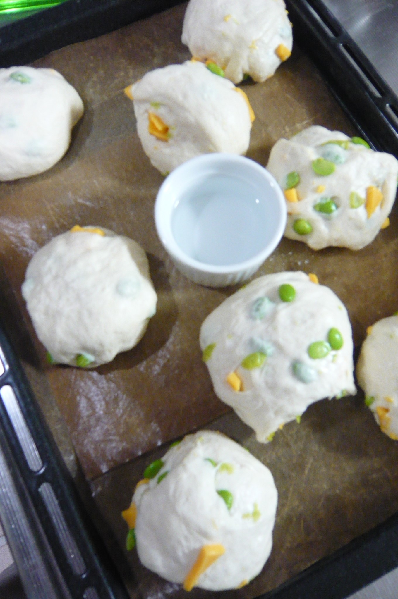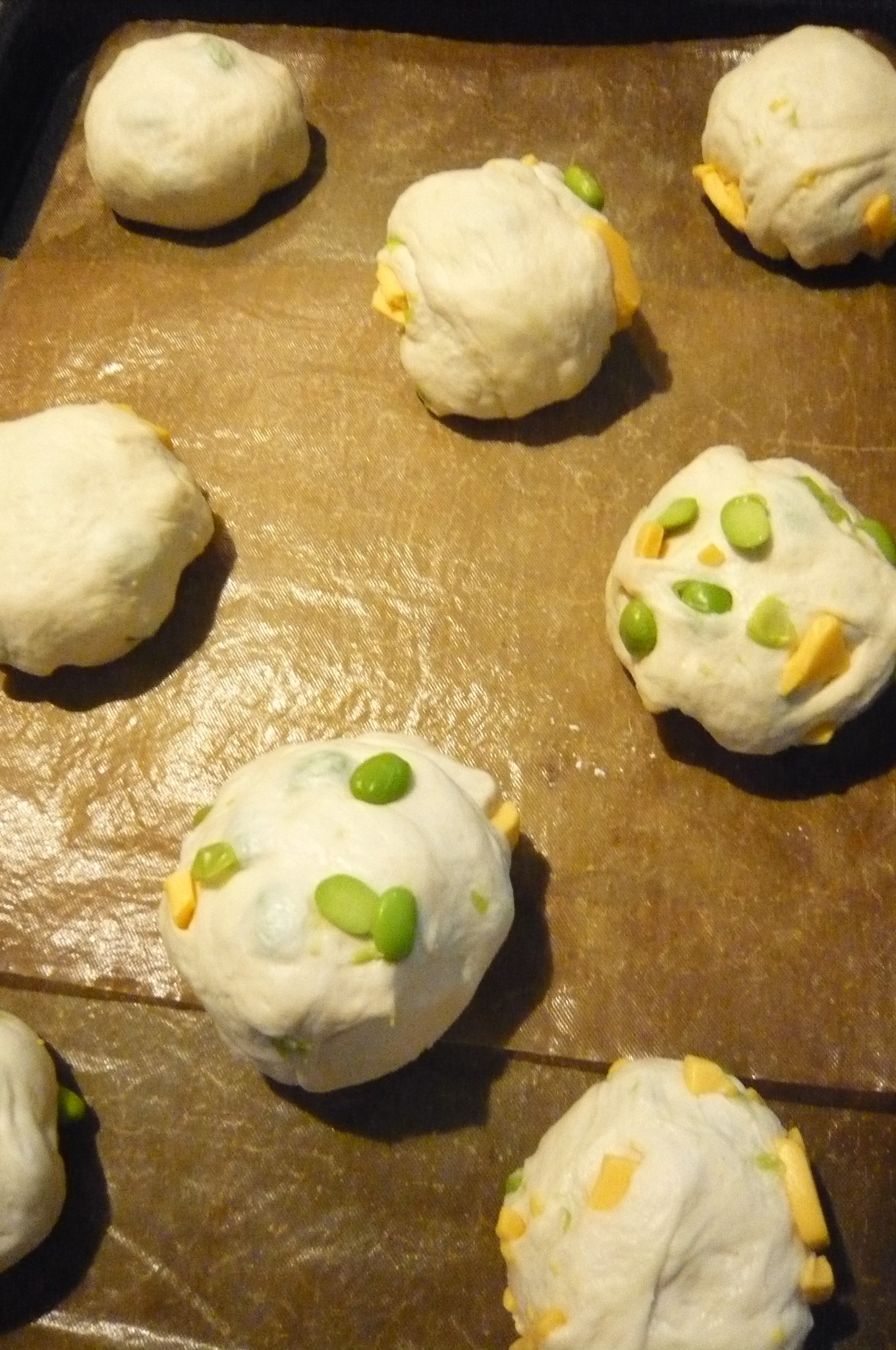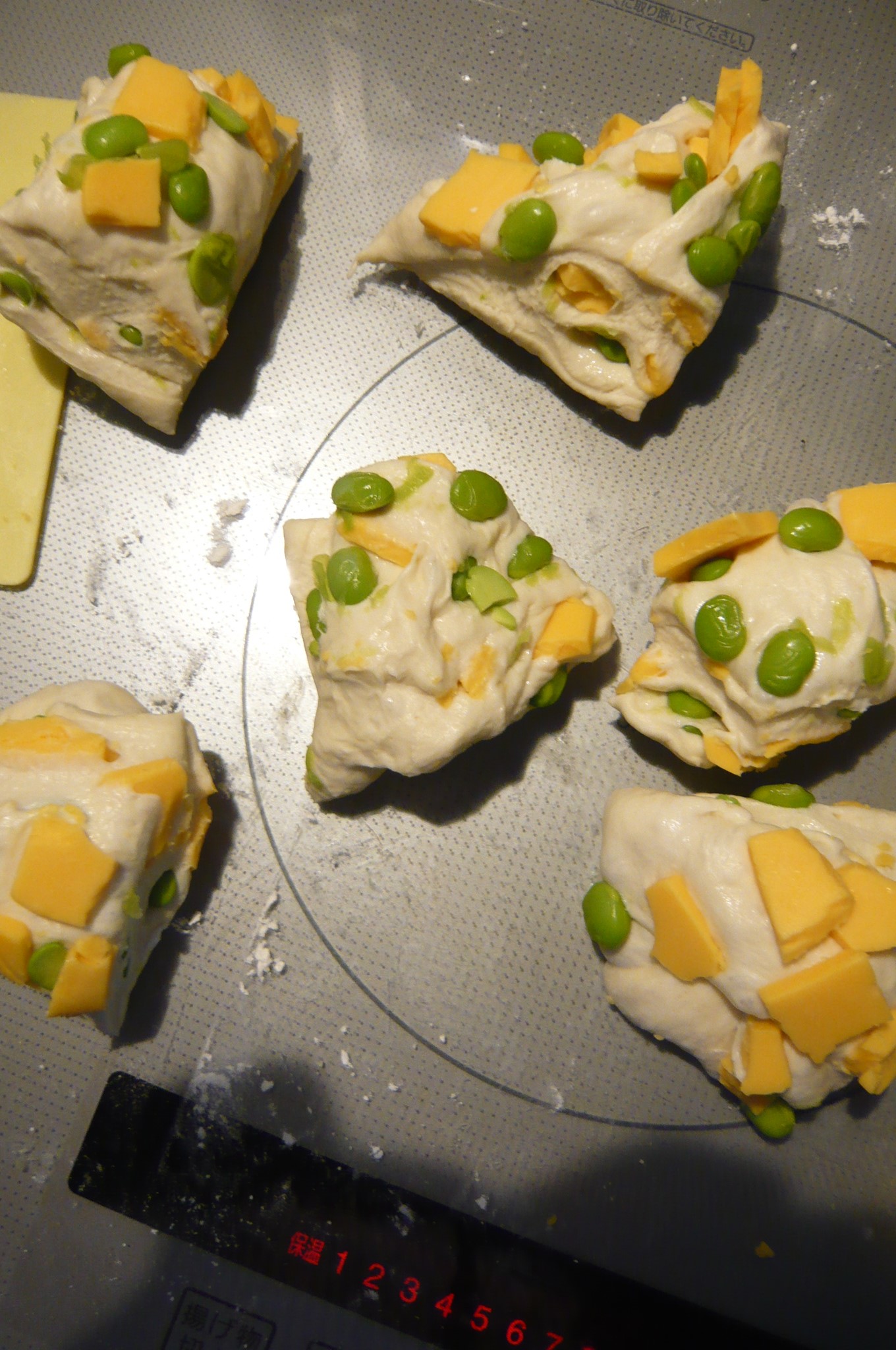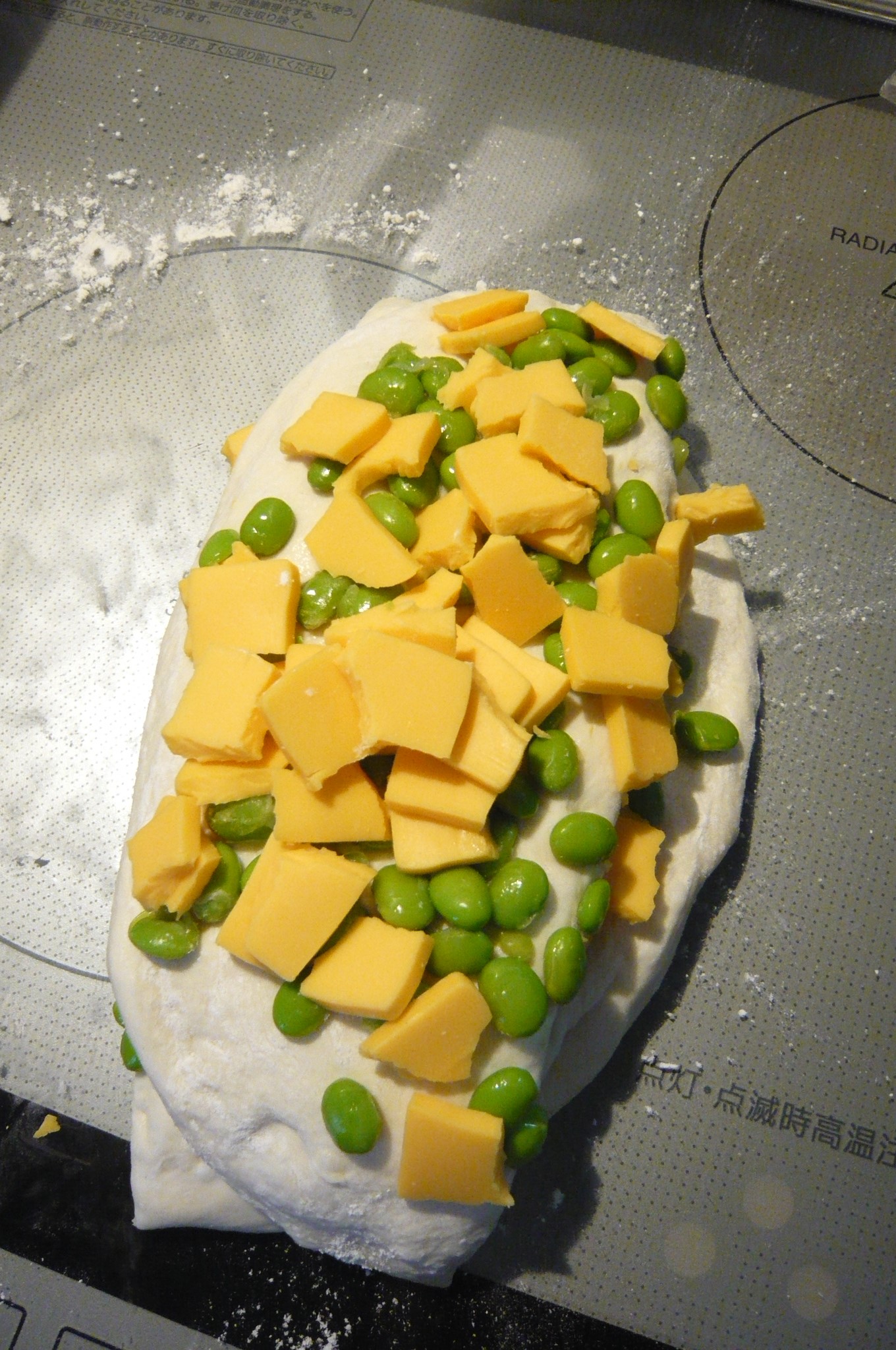 台に打ち粉をして生地を取り出し、生地を20cm程に伸ばす。枝豆とチーズをのせ、半分にスケッパーで切り、半分の生地を上に重ねる。