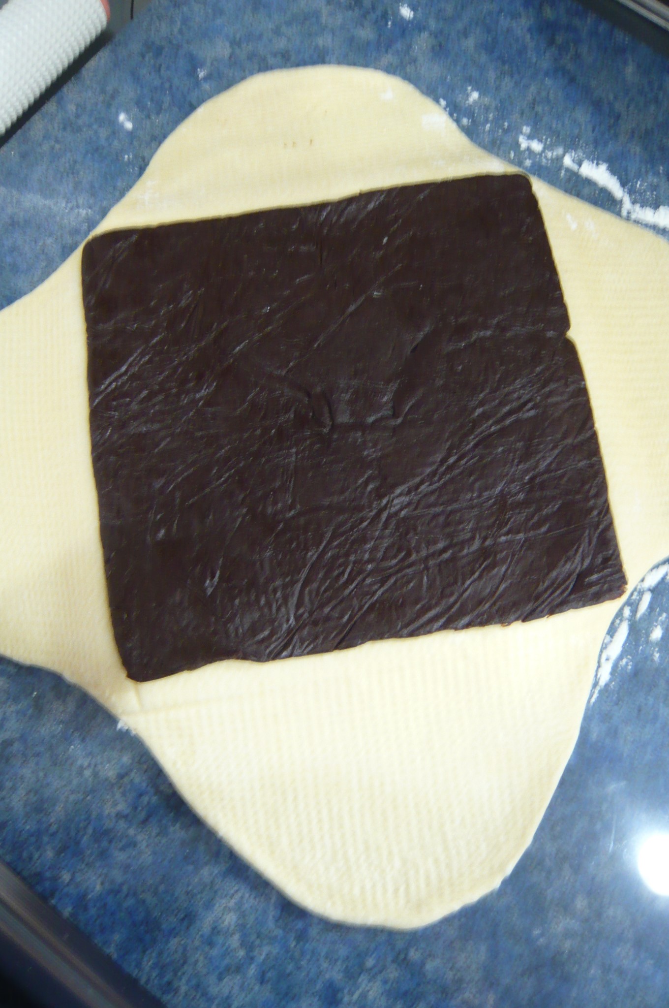ショコラシートをどけ、四つ角を薄く伸ばす。