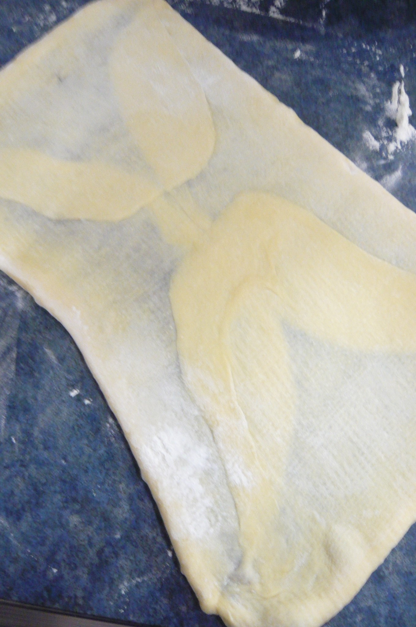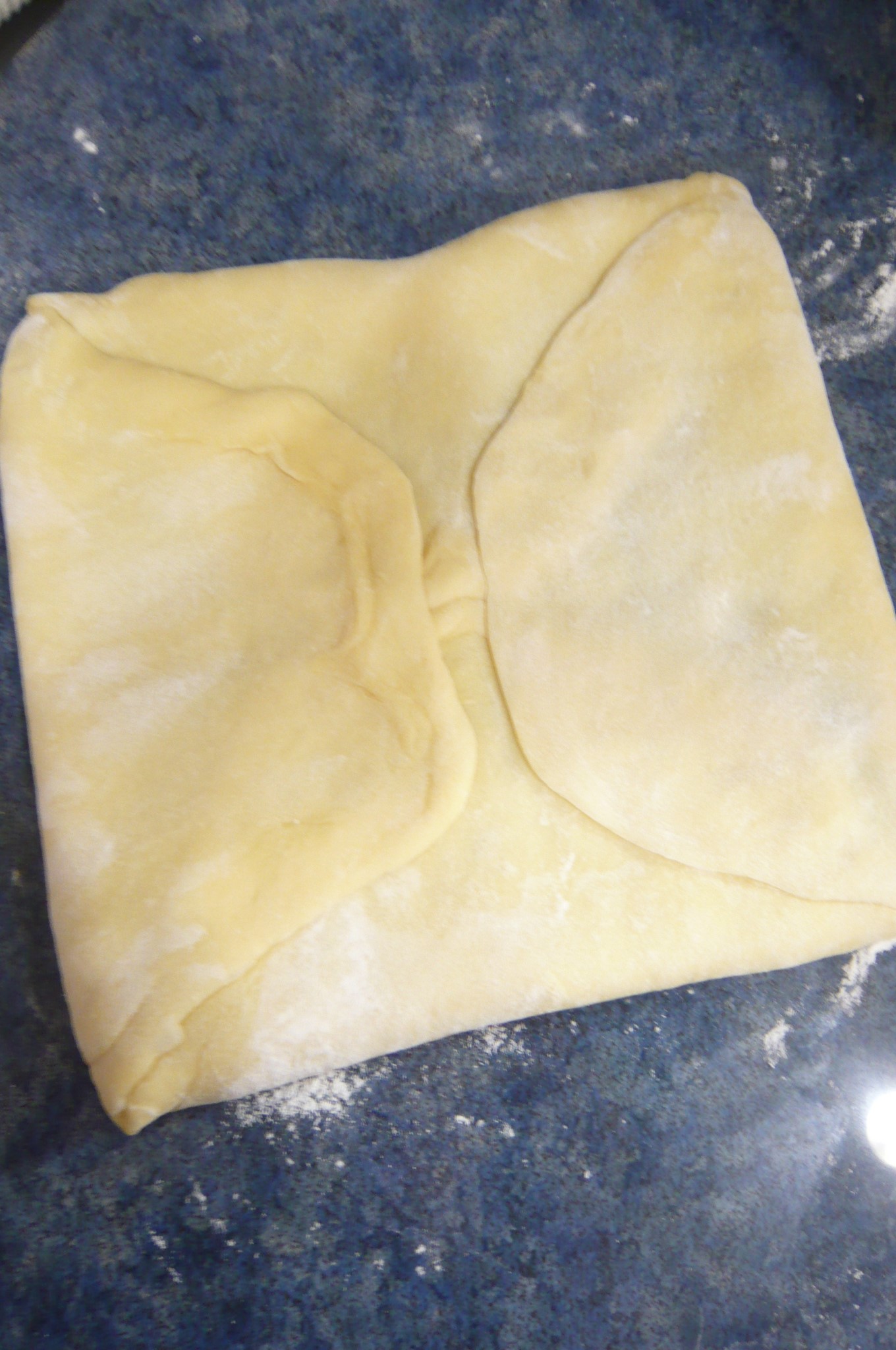 1/3に折り、生地を90度回転させ横の長さはそのままに、45cmほどの長方形に伸ばす。1/3に折る。さらにこの作業をもう一度繰り返す。