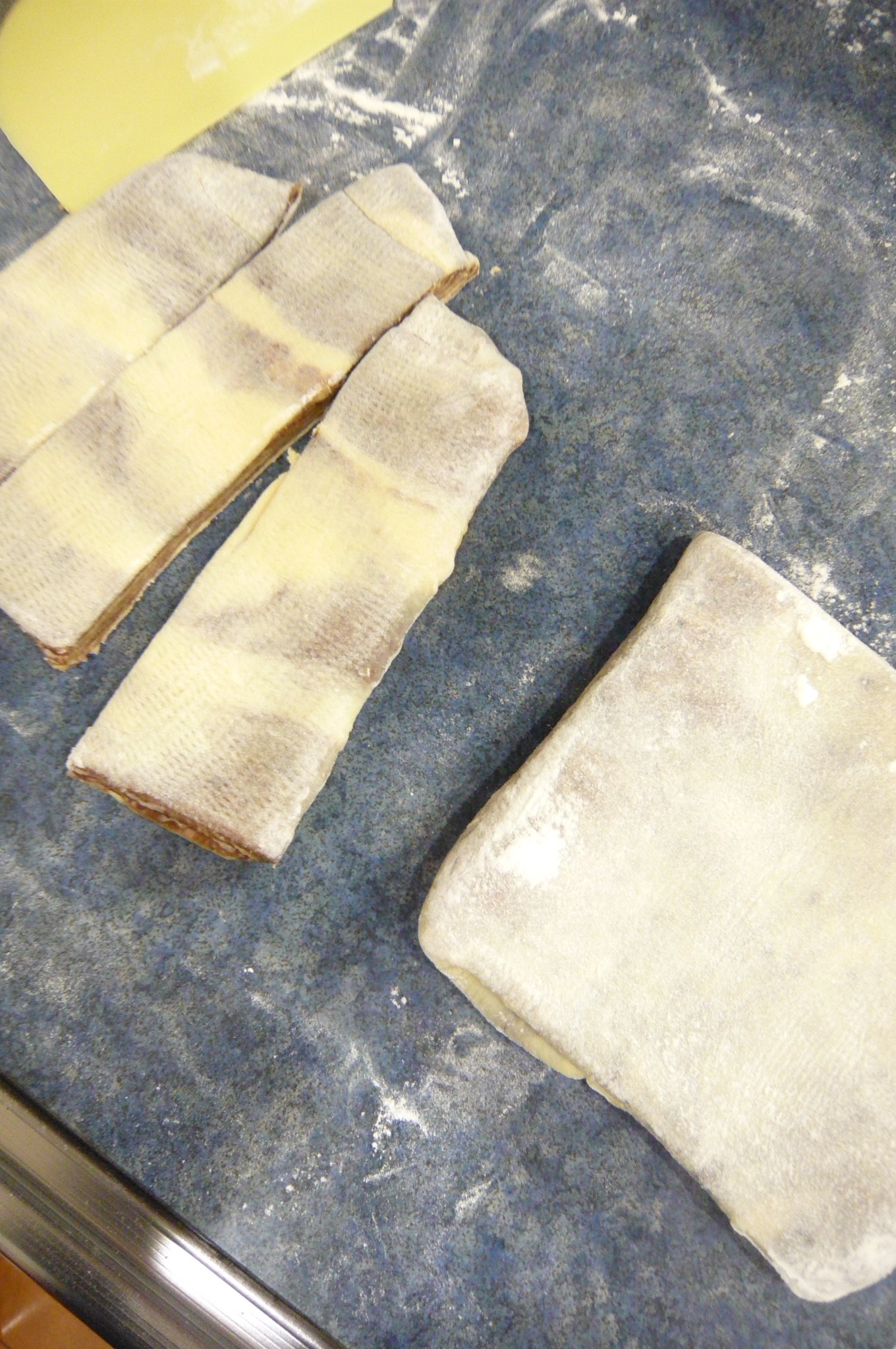 台に打ち粉をして、生地を出しガスを抜く。ショコラシートより一回り大きいくらいの大きさに伸ばし、