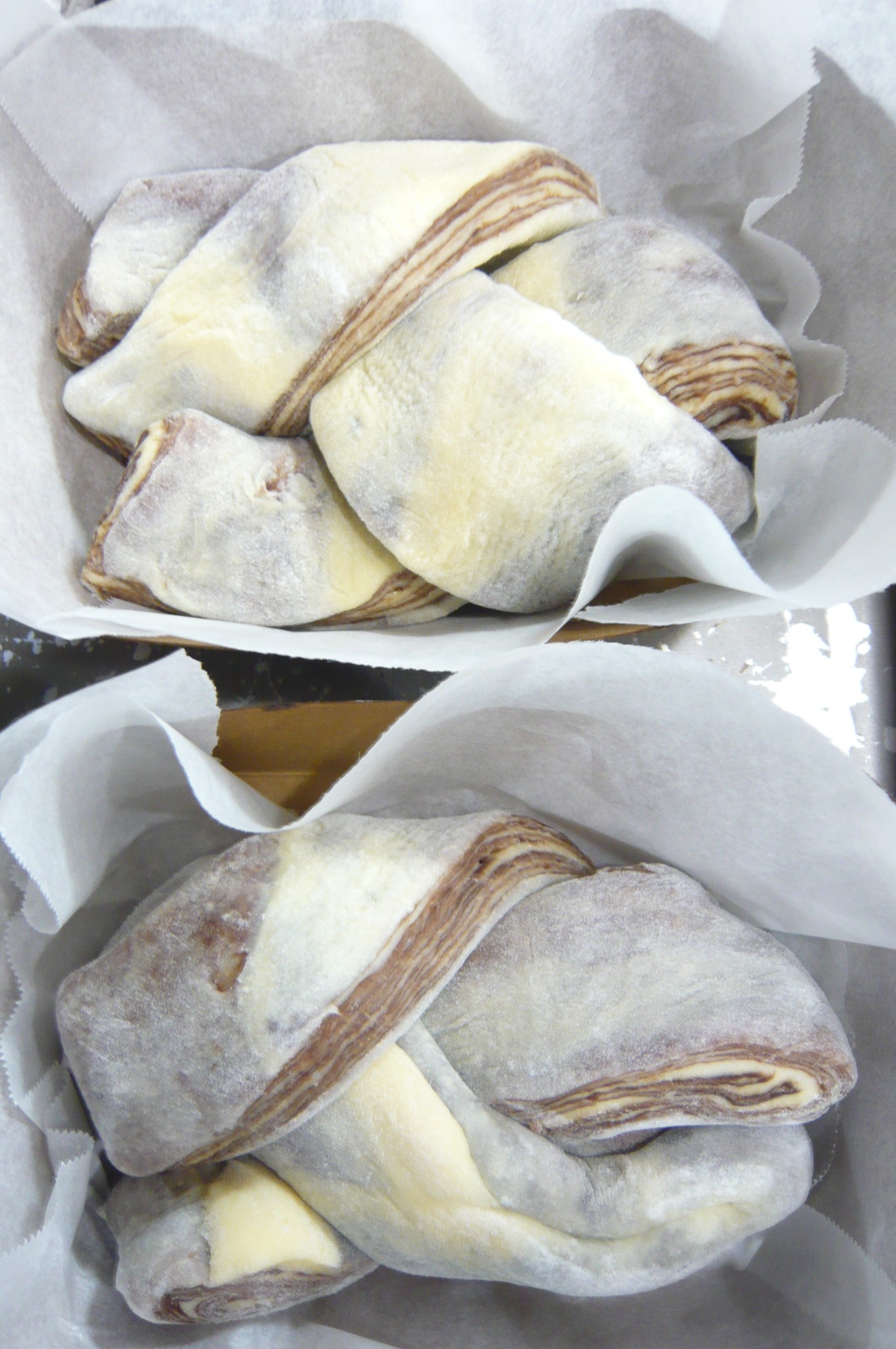 打ち粉をふった台に生地を置き、24×30cm程に伸ばす。短いほうを6等分に切り、3本ずつにまとめて三つ編みにする。