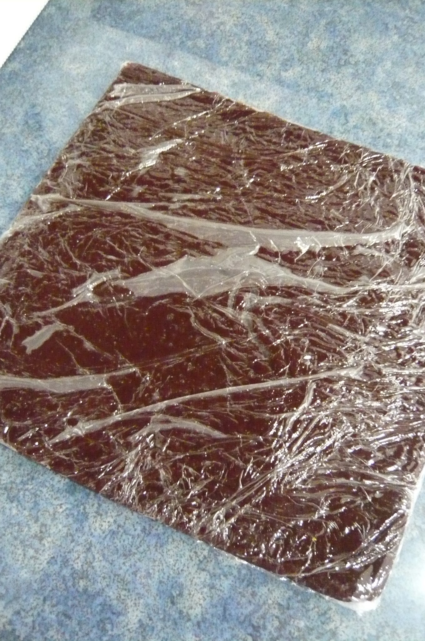 ラップを2枚重ね、その上に熱い状態のココアシートを置き、さらにラップを2枚かぶせる。
