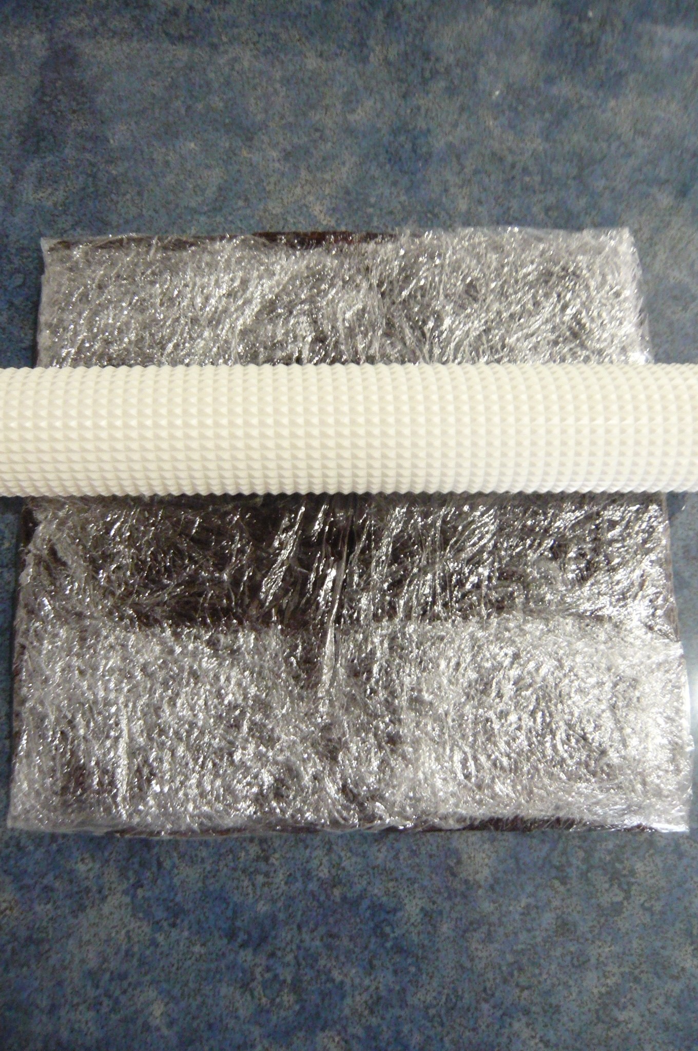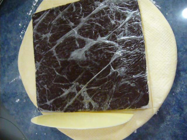 ラップを外したショコラシートを置き、伸ばした角をシートがしっかり収まるようにかぶせる。(空気が入らないように)