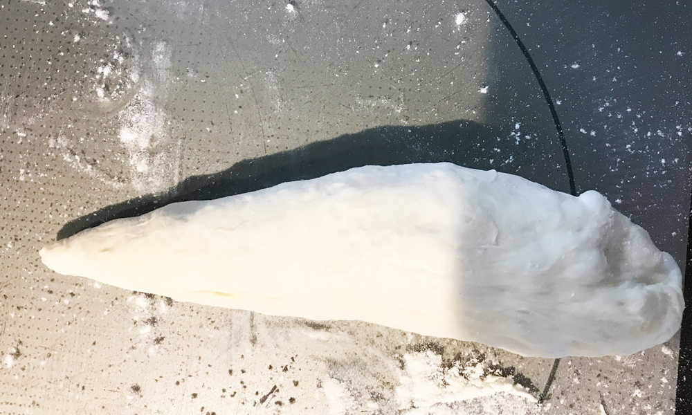 手粉をして、ガスを軽く抜き、生地を持ち、下から上に両手でこすりながら、しずく型にする。