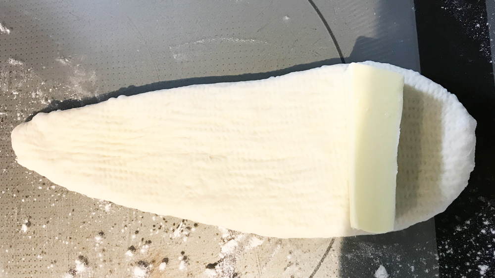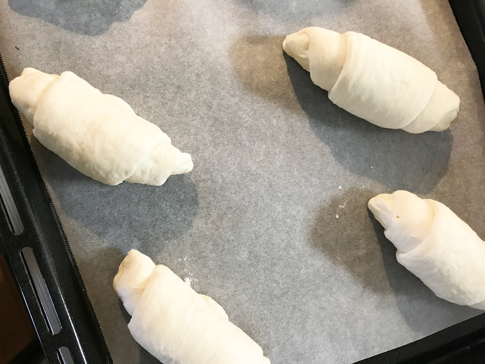麺棒で、伸ばし、バターを置く。バターロールを作る要領で、太いほうからくるくると巻き、先端はしっかりとつける。