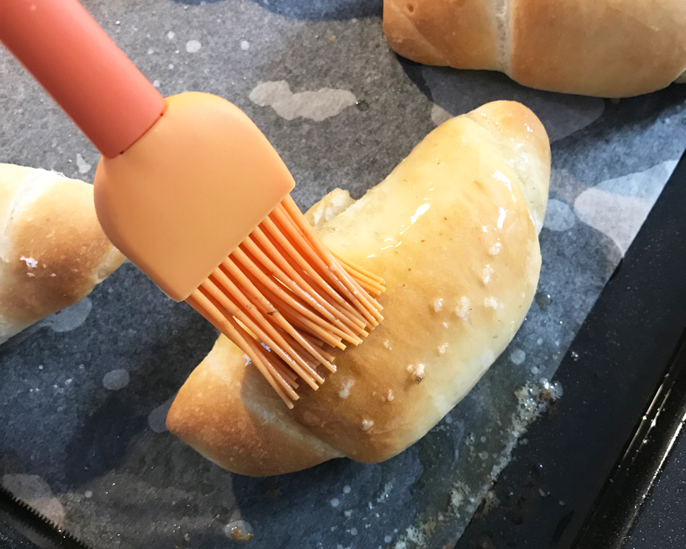 焼上がったら、天板に染み出たバターを刷毛で塗りこむ。