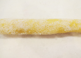 冷凍庫から生地を取り出し、表面に刷毛で卵白(または水)を薄く塗る。グラニュー糖を台に広げ、卵白を塗った生地を転がして表面につける。