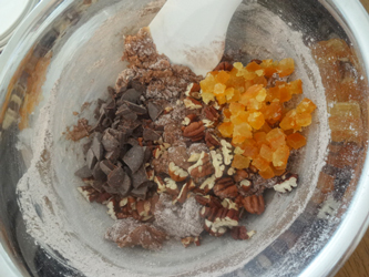 粉気が残っているうちにナッツとオレンジピール、チョコを加える。