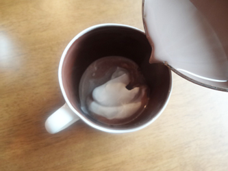 カップの端から静かにココアを注ぐ。お好みでココアを茶漉しでふるう。