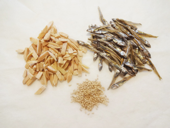 フライパンにあめの材料を全て入れ、中火で煮詰める。泡が大きくなってとろみがついてきたら火を止め、ごまめ、アーモンド、ゴマを入れ手早くからめる。