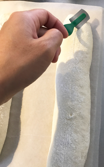 生地を2等分して、3つ折にして、天板に並べる。ビニール袋で包み、ベンチタイム30分。