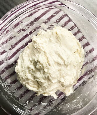 上から茶漉しで粉を振り、スケッパーで周りをはがし、ボウルを逆さにして、台に生地を出す。