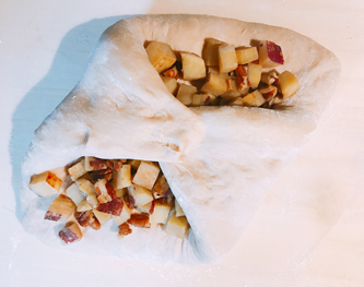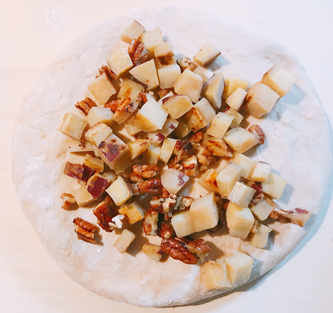 手粉をし、ガスを抜き、一回り大きく伸ばし、サツマイモ半量、ピーカンナッツ半量のせる。