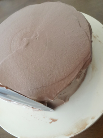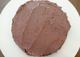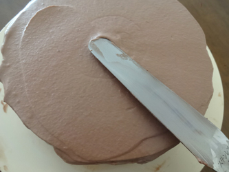 表面の飾り用にクリームを少量別にとり、残りをスポンジの上に全てのせ、表面全体にクリームを塗る。