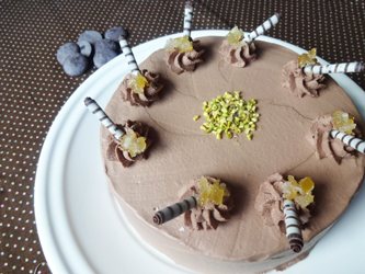 飾り用のクリームを表面に絞り、巻きチョコ白樺、オレンジピール、ピスタチオなどで仕上げる。冷蔵庫で冷やす。