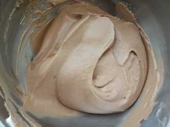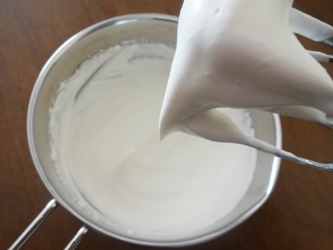 別のボウルに生クリームを入れ、氷水につけながら軽く角が立つ程度(7分立て)に泡立てる。