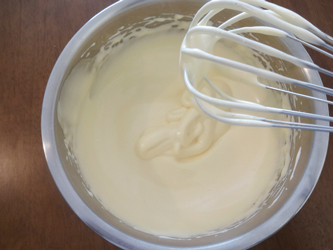 湯せんからはずしハンドミキサーの最高速で白くもったりとするまで泡立てる。