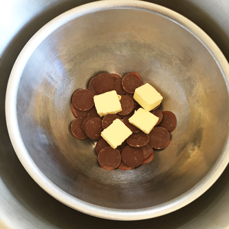 ボウルにタブレットチョコレートと無塩バターを入れて、湯煎で溶かします。