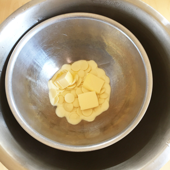 ボウルにタブレットチョコレートと無塩バターを入れて、湯煎で溶かします。