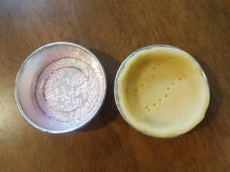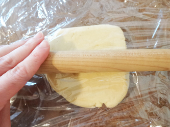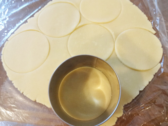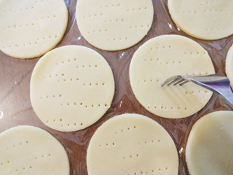 冷蔵庫に10分ほど入れて生地が固くなったら取り出し、直径7cmの円に抜き、フォークでピケ(生地に穴をあける)する。