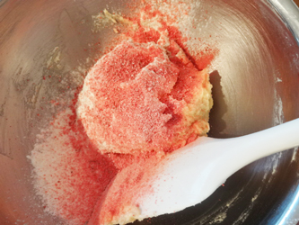 型の底にざらめを入れそこへ3の生地を敷きこむ。型は冷蔵庫で休ませまる。