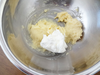 カスタードクリームを作る。 カスタードクリームの作り方を参照し、出来上がりから135g用意する。別のボウルで生クリーム50gを固めに泡立て木べらで混ぜ合わせる。※しっかり混ぜない。マーブル状でよい。