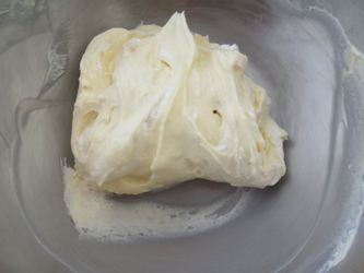 生クリーム50gとグラニュー糖5gを角が立つ絞りやすい硬さに泡立てる。星口金をつけた絞り袋に入れ中央に絞る。