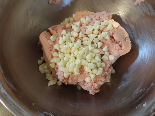 ふるった粉類を加え、ゴムベラでさっくりと混ぜる。大体まとまったらホワイトチョコチップを加える。
