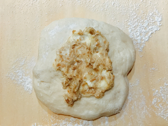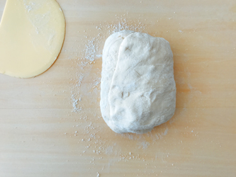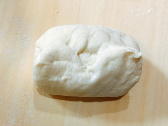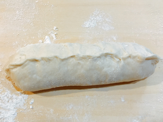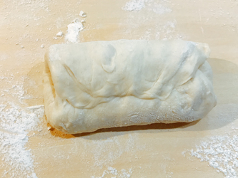 カードで生地を台に戻す。10cmほどの楕円に生地を広げ、メープルバター1/4を真ん中に置く。1/3真ん中でたたみ、反対側から生地を重ねる。更に半分に折り指で押さえ端をつまんでとじ目をしっかりとじる。ころころと転がし18cmくらいの棒状にする。