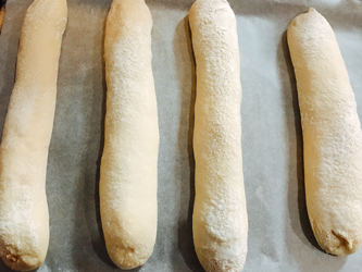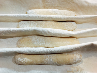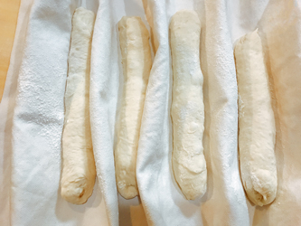 キャンパス地に粉を振り、生地を離して並べる。生地と生地がくっつかないようにキャンパス地にひだをつけて生地に付かないように天板ごとビニール袋で包み、生地が乾かないように2次発酵30分。