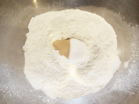 ボウルに粉類を入れ、中央を窪ませてグラニュー糖とドライGを入れ離れたところに塩を入れる。