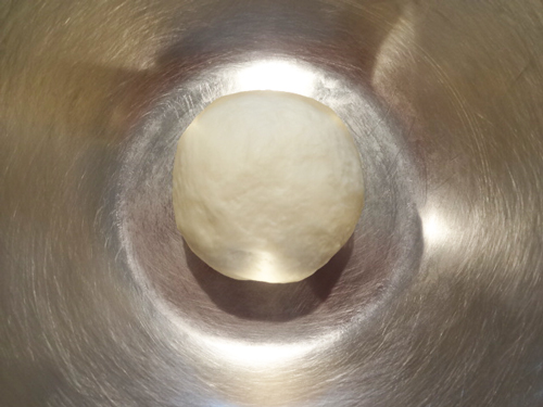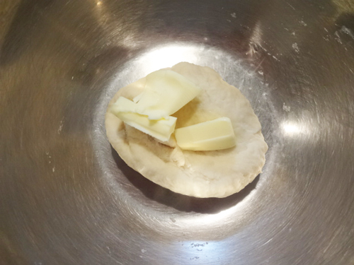 温めておいた牛乳を中央に注ぎ生地をこね、ひとつにまとまってきたらバターを入れ5~10分よくこねる。