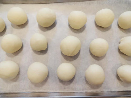 生地の中央を指をさして生地が戻ってこないようになれば発酵終了。ガス抜きをしスケッパーで16等分に分割して丸める。