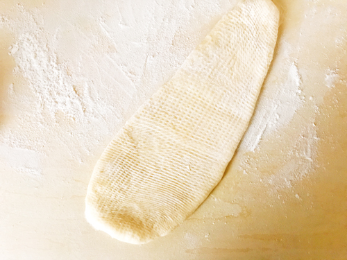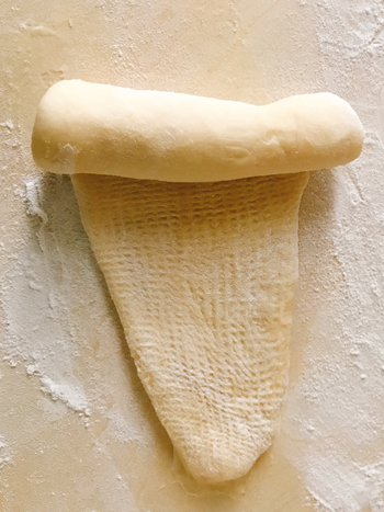 麺棒で、生地を伸ばし、平らな円錐型にして、面積の大きいほうから手前に引っ張りながら生地を巻いていく。