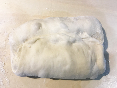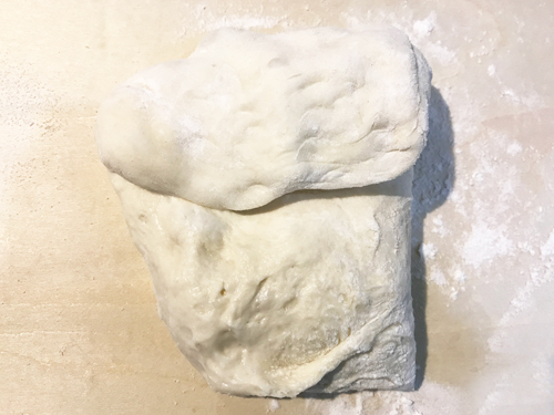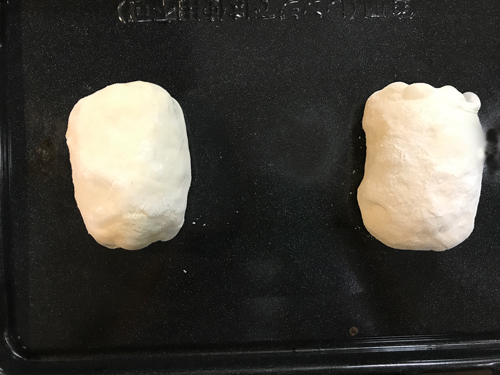 スケッパーで2等分にして、三つ折にして、天板に並べる。ビニール袋で天板ごと包み、ベンチタイム30分。