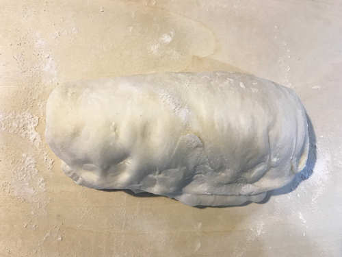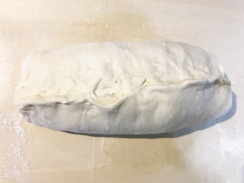 更に半分に折り指で押さえ、端をつまんでとじ目をしっかりとじる。ころころと転がし25cmくらいの棒状にする。