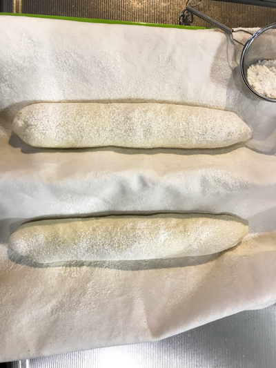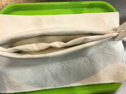 キャンパス地に粉を振り、生地を離して並べる。生地と生地がくっつかないようにキャンパス地にひだをつけて、洗濯ばさみでとめる。生地に付かないように天板ごとビニール袋で包み、生地が乾かないように2次発酵30分。