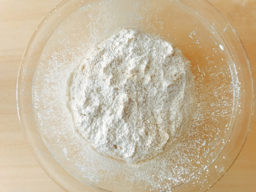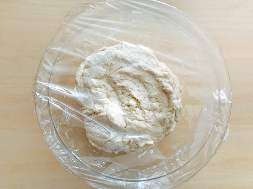 分量の塩を振り入れ、周りから畳むように混ぜる。70回ほど。ラップをして、30分休ませる。