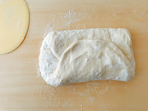 カードで生地を台に戻す。1/3真ん中でたたみ、生地の端を指で押さえる。下1/3も真ん中でたたんで指で押さえ、