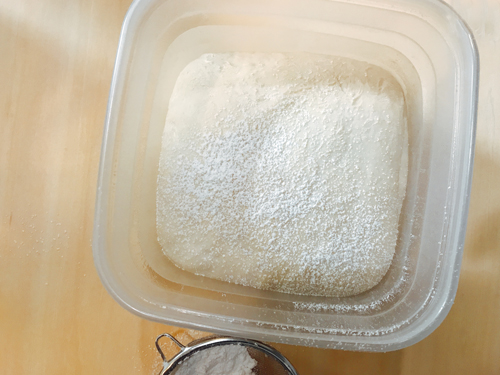 上から茶漉しで粉を振り、スケッパーで周りをはがし、ボウルを逆さにして、台に生地を出す。