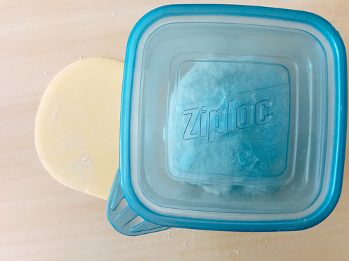 粉を振り、一度台にだし、生地を三つ折にして、蓋付き容器に入れ、野菜室で1時間生地を休ませる。