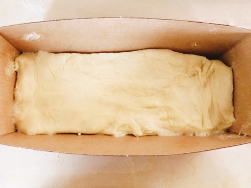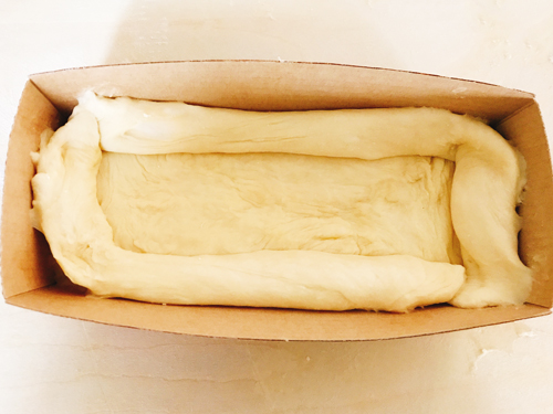 パウンド型に生地を入れ、縁の部分ものせて角をしっかりと付ける。全体をビニール袋で覆い暖かいところで二次発酵約1時間。(生地がふっくらとしたら発酵完了)