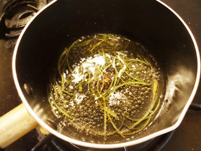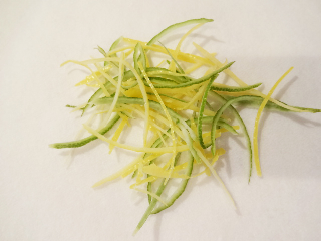 レモンの皮とライムの皮を薄くスライスし5cm×0.2mmの千切りにする。沸騰したお湯で1分茹で、水気をとる。