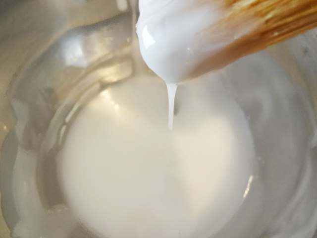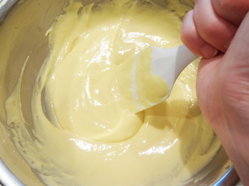 常温の全卵を1に少しずつ分けて加える。分離しやすいので、入れるごとによく混ぜる。