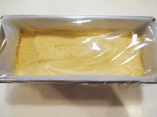 型に流し表面を平らにしてラップ材をかぶせる。オーブンの発酵機能で1時間発酵させる。(温かい常温におく場合は1時間半~2時間)※生地は少しもこもこし、泡がぷくぷくしている状態