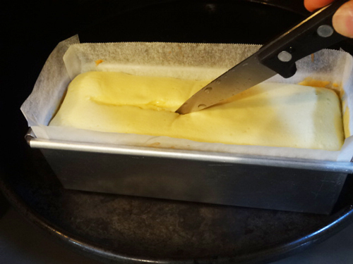 10分経ったところでオーブンを開け、水で濡らしたナイフで中央に一本線を入れる。