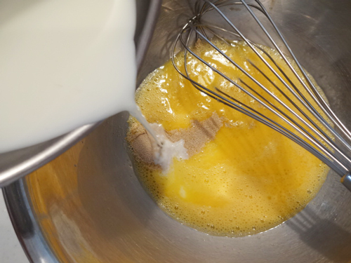 ボウルに卵とグラニュー糖を入れ泡だて器で混ぜる。