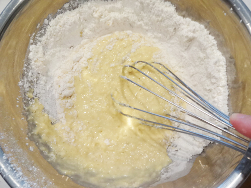 薄力粉を加え滑らかになるまで混ぜ、溶かしバター、バニラオイルを加える。